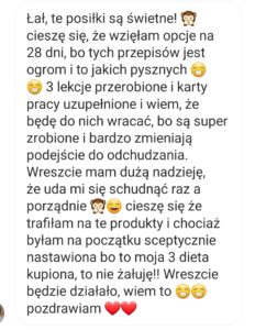 Pani Dario, jestem zachwycona tym jadłospisem! Nie dość, że jestem ciągle najedzona, to jeszcze mam w diecie swoją ukochaną czekoladę. Nie mam zastrzeżeń do żadnych posiłków, a wręcz nie mogę doczekać się gotowania!! 3 kg za mną – jak dla mnie to super wynik w ciągu jednego miesiąca. Dziękuję za wszystkie wskazówki!