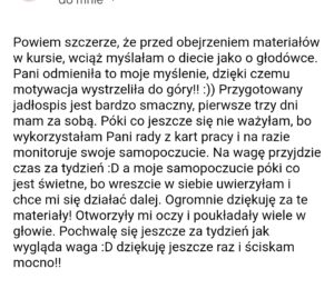 Po miesiącu jedzenia wedle zaleconych przez Panią wskazówek muszę przyznać, że widzę ogromny progres!!!! Rzeczywiście nie podjadam! Widzę też ubytek na wadze, około 2 kg, ale to nie jest takie ważne na razie. Ważniejsze było opanowanie jedzenia i myślę, że to mi się udaje. Nareszcie!!! Dzięki Pani, rzecz jasna :)!!!!!