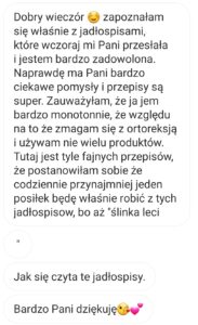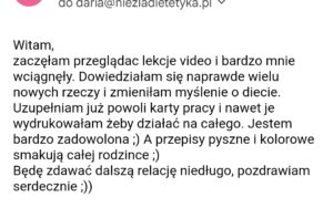 Dziękuję za jadłospis i baaardzo bogaty zestaw materiałów edukacyjnych. Jest mi aż głupio, ponieważ za tak niewielką kwotę, jaką zapłaciłam za indywidualny jadłospis, otrzymałam tak solidna porcję wiedzy, smaczny i dopasowany jadłospis i przede wszystkim Pani zaangażowanie. Bezcenne, naprawdę. Bardzo, bardzo dziękuję 🙂
