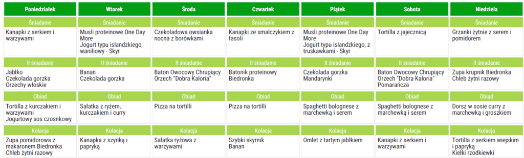 - GOTOWY JADŁOSPIS NA 7 LUB 14 DNI. Wszystkie posiłki są szybkie oraz możesz zabrać je ze sobą na wynos.